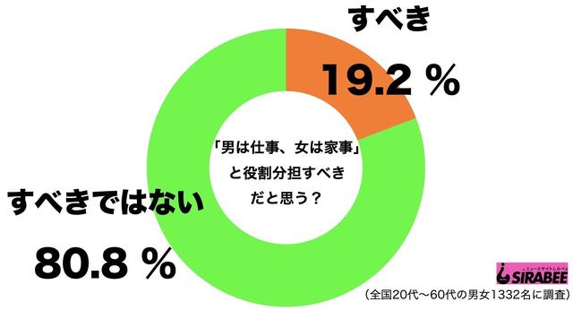 ちなみに、しらべぇ編集部が全国の20代~60代の男女1,332名を対象に「『男は仕事、女は家事』と役割分担すべきか」という意識調査を実施したところ、8割以上の人が「『男は仕事、女は家事』と役割分担すべきではない」と回答している。