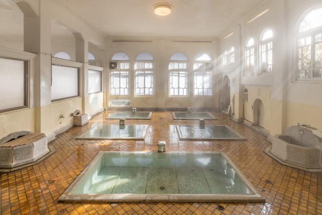 アーチ形の大きくとられた窓から差し込む自然光が浴室内に降り注ぐ様子が、実に美しい温泉だ。タイル張りの床に5つの浴槽が並ぶ特徴的な作りで、湯船のそこからお湯が湧き出ている。