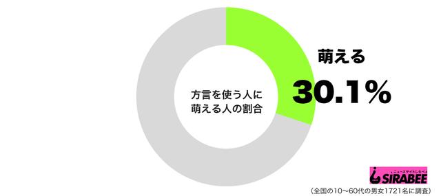 甲州弁がブサイクであるか否かは意見が分かれるところだが、「方言を使い人に萌える」人は一定数存在する。しらべぇ編集部が全国10〜60代の男女1,721名に実施した調査では、全体の30.1%が「萌える」と回答しているのだ。