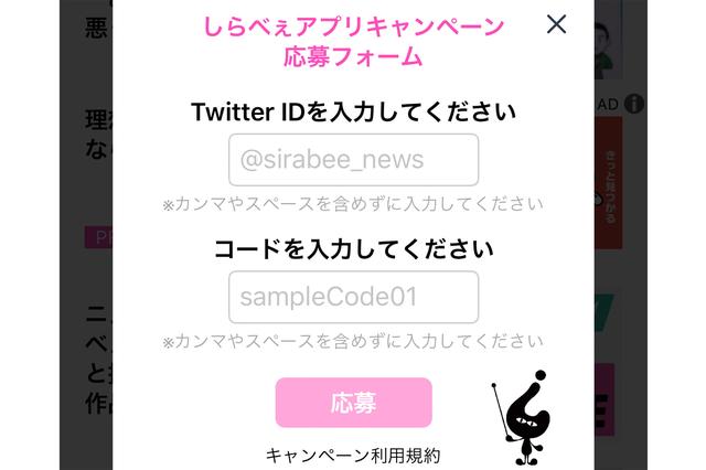 (3)こちらの画面にご自身の「ツイッターID」と「投票コード」(後述)を入力して、応募ボタンを押してください