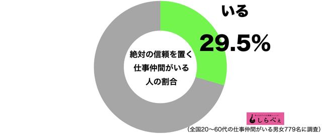 しらべぇ編集部で全国20〜60代の仕事仲間がいる男女779名を対象に調査したところ、約3割が「絶対の信頼を置く仕事仲間がいる」と回答している。