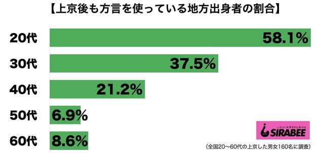 上京する地方出身者にとって大きな壁となる「方言」問題。しらべぇ編集部が全国20〜60代の東京に移り住んだ地方出身者に調査したところ、「上京してからずっと方言を使っている」と回答したのは全体の26.3%と少数派の結果に。