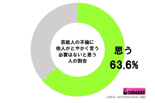 ワイドショーで不倫報道を扱う場合、不倫に怒るコメンテーターがいる一方で、ケンコバのように「ほぼノーコメント」というケースもある。ちなみに、しらべぇ編集部が全国10〜60代の男女1,653名に調査したところ、63.6%が「芸能人の不倫に他人がとやかく言う必要はないと思う」と回答している。