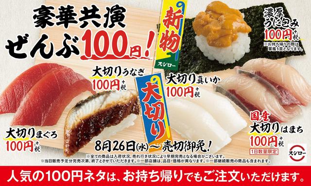 株式会社あきんどスシローは、8月26日(水)から全国の『スシロー』にて、新物の「天然うに」や「まぐろ」「はまち」などの人気ネタを大切りにして100円(税別)で提供するフェアを実施すると発表。