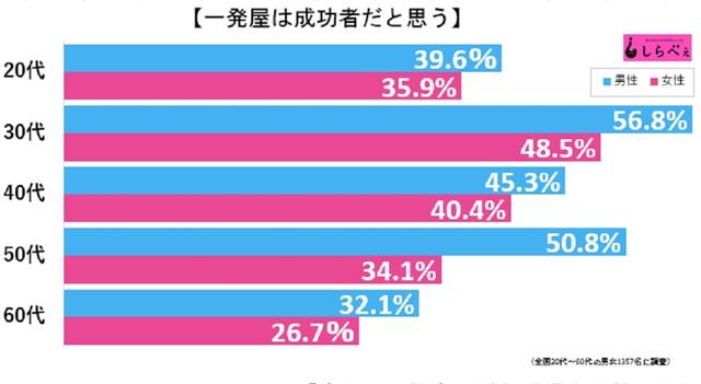 なお一発屋芸人についてはこんな調査がある。しらべぇ編集部では、全国20〜60代の男女1,357名に「芸能人について」の調査を実施。「一発屋は成功者だと思う」と答えた人は、全体で40.9%だった。