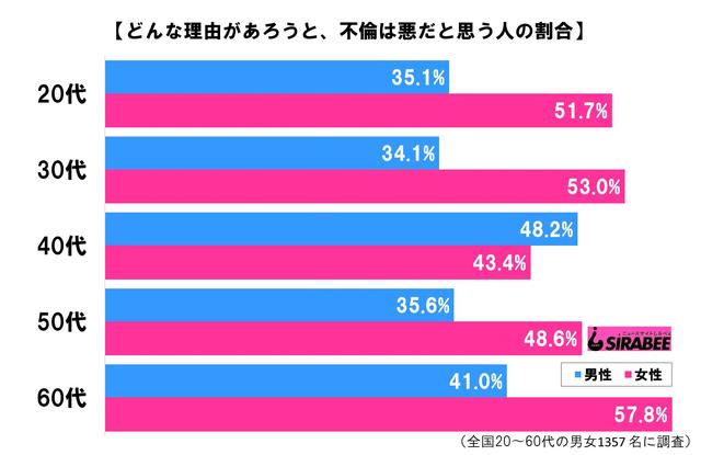 しらべぇ編集部が全国の20代~60代の男女1,357名を対象に実施した調査では、全体で45.0%の人が「どんな理由があろうと、不倫は悪だと思う」と回答している。