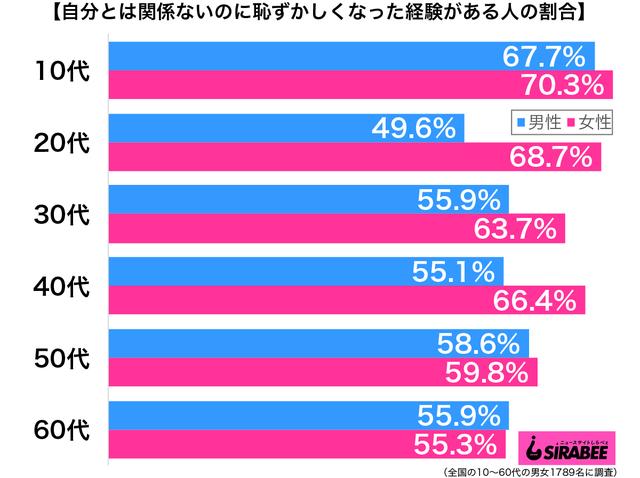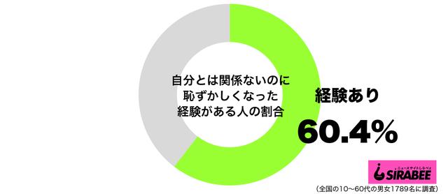 「自分とは関係ないのに恥ずかしくなった経験がある」と答えた人は、全体で60.4%だった。
