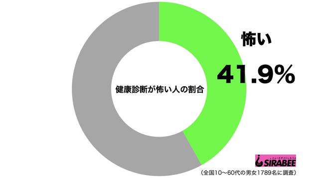 健康診断では、胃カメラやバリウムといった日頃見慣れない機器を使うことが多く、病院での検査に苦手意識がある人もいるのではないだろうか。ちなみに、しらべぇ編集部が全国10〜60代の男女1,789名に調査したところ、全体の41.9%が「健康診断が怖い」と回答している。
