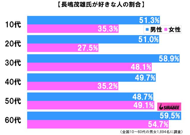 最も好きな人が多かったのは、長嶋氏の現役時代を知る60代男性で59.5%。女性も54.7%となっており、根強い人気を感じさせる。また、10~30代の男性も好きな人が5割を超えた。