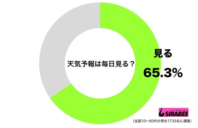 そこで、しらべぇ編集部が、全国10~60代の男女1733名を対象に調査したところ、「天気予報は毎日見る」と答えた人は、全体の65.3%。