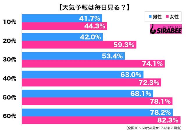男女別では、男性は60.2%、女性は69.8%と、女性のほうが9.6ポイント高い結果。女性は天気によって髪型や服装など考える人も多いだろう。そんな傾向が現れたのかも。