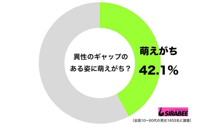普段とのギャップがこれでもかと活きた今回の投稿に、心を鷲掴みにされた人も多いことだろう。ちなみに、しらべぇ編集部が、全国10~60代の男女1,653名を対象に調査を実施したところ、42.1%が「異性のギャップのある姿に萌えがち」と回答した。