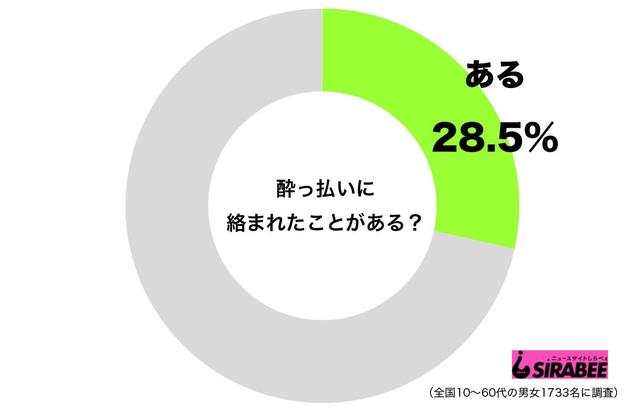なお酔っぱらいについてはこんな調査が出ている。しらべぇ編集部が、全国10~60代の男女1733名を対象に調査したところ、「酔っ払いに絡まれたことがある」人は、全体の28.5%。