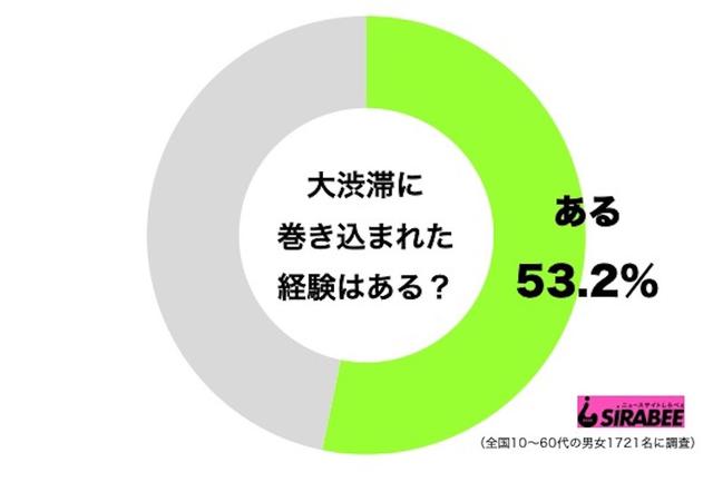 なお運転についてはこのような調査がある。しらべぇ編集部が、全国10~60代の男女1,721名を対象に調査したところ、「大渋滞に巻き込まれた経験がある」人は、全体の53.2%。経験の無い人が46.8%だった。