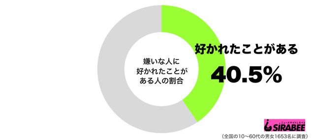 しらべぇ編集部が、全国10代~60代の男女1,653名を対象に調査を実施したところ、「嫌いな人に好かれたことがある」と回答したのは全体の40.5%。