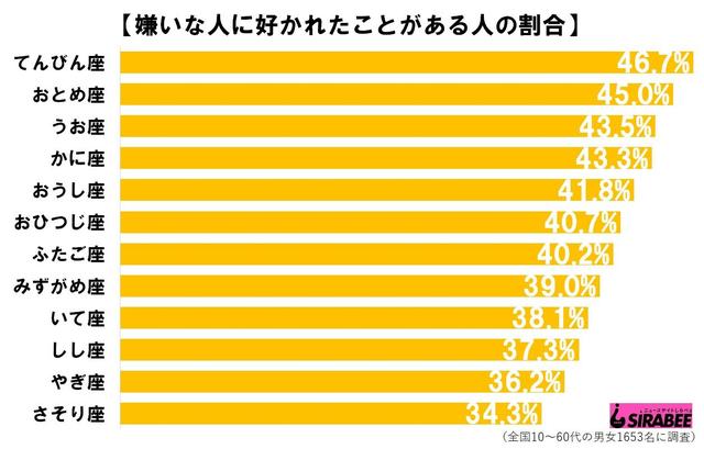 また、人間関係を大切にする人が多く、たとえ好ましくない人とも中々縁を切れないことがある様子。その優しさもあってか、「嫌いな人から好かれる」という経験者がもっとも多いのだろうか。