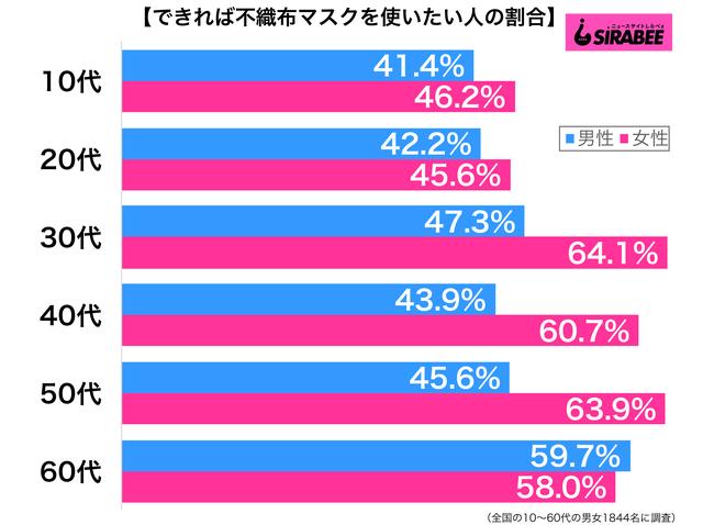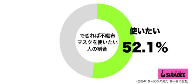 しらべぇ編集部では全国10〜60代の男女1,844名を対象に調査したところ、全体の52.1%が「できれば不織布マスクを使いたい」と回答した。