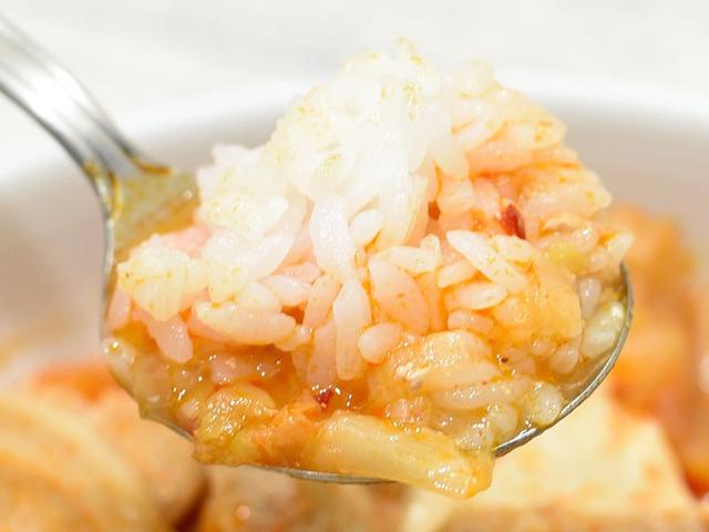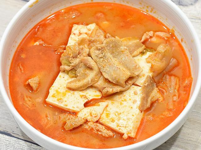 おだやかな辛旨スープで、適度にキムチの酸味も効いた味わい。コレがいい。脂っこさを感じさせず、後味がわりとすっきりしているんですよね。主役の豆腐はそれ自体に旨みがあるし、スープとの絡みもいいから、“豆腐だけ浮いた味” みたいにならないのも好印象。豆腐がうまいんです。豚肉は安っぽい味ではありますが、量もあるので不満はないかと。ごはんを用意してどうぞ。
