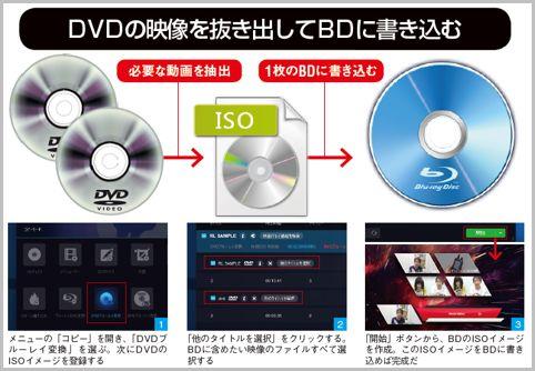 数枚あるDVDをまとめて1枚のブルーレイにコピーするのに使うのは「DVDブルーレイ変換」機能です。複数のDVDのISOイメージを登録して、ブルーレイにまとめてコピーするだけです。