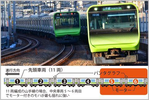 例えば、東京・山手線は11両編成で、2~3、5~6、8~9両目がモハ車両になります。この場合、電車事故を避けるなら真ん中辺りの5~6両目がよいでしょう。