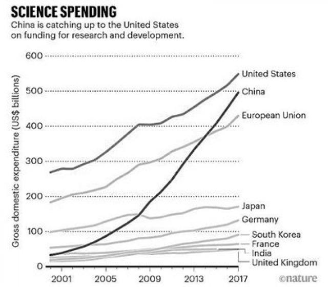 同報告書によると、米国の研究開発費が2000−17年における年平均成長率は4.3%だが、中国は同17%以上。またドイツや韓国などの国も研究開発費の成長率で米国を上回っている。