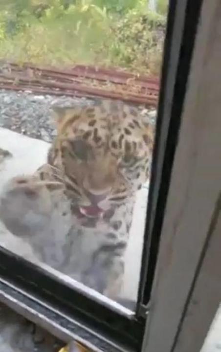 ヒョウは、于さんらがいる建物の方にやってきた。于さんらはガラス戸越しに屋外の様子を動画撮影していた。中国メディアの新浪網が掲載した動画を見ると、ヒョウは于さんらをにらみ、鼻の周囲にしわをよせる表情で威嚇している。しかし、ガラス戸を破ることはせず、しばらくすると別の方向に歩いていった。