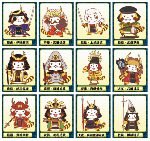 ラスカルが織田信長、豊臣秀吉、徳川家康に真田幸村、伊達政宗と全国津々浦々から12人の武将に扮して缶バッジや湯飲み、スマホケースなど様々なアイテムに登場します。