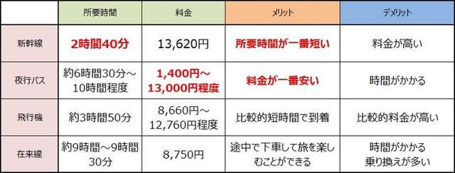 まずは、各移動手段の所要時間・料金・メリット・デメリットをまとめました。
