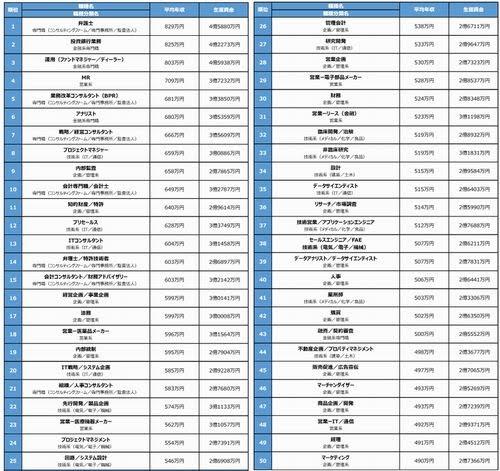 2018年の全体の平均年収は414万円となった。全166職種のうち、平均年収ランキング1位は「弁護士」(829万円)だった。これに、「投資銀行業務」(825万円)、「運用(ファンドマネジャー/ディーラー)」(803万円)が続き、「専門職」、「金融系専門職」系の仕事がトップ10のうち7つを占めたという。