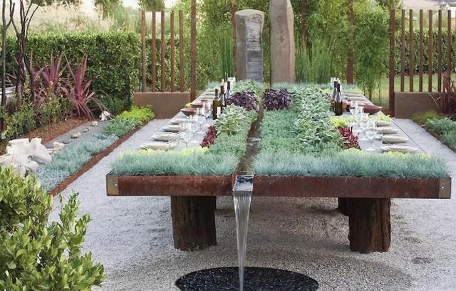 Olhando rapidamente, esta mesa parece ser apenas uma bancada com vasos de hortaliças e temperos, além de ter um belo riozinho passando pelo meio. Depois notamos os pratos e taças, e percebemos que na verdade trata-se de uma mesa com a melhor decoração do mundo. É impossível comer um alface mais fresco que este.