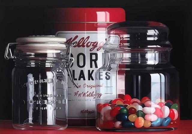 Esta imagem parece tão real que nosso cérebro insiste em pensar “fotografia!”. Mas isso é uma pintura hiper-realista a óleo. O autor é o artista espanhol Pedro Campos, e seus objetos favoritos para retratar são jujubas e marcas icônicas como Coca-Cola, Kellogg’s e Campbells’ Soup.