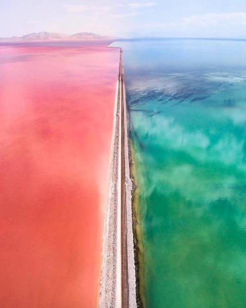 Esta foto é do Great Salt Lake (Utah), e este local pode ser visitado. A má notícia é que as bactérias que causam essas belas cores também causam um cheiro horrível. Este é o maior sago de água salgada do hemisfério norte (4,400 km2 de área) e é dividido em duas porções por uma estrada de ferro. A porção norte tem uma concentração de sal dez vezes maior que a da água do mar, portanto poucos organismos conseguem viver ali, exceto alguns organismos que adoram sal. Pigmentos nesses organismos, incluindo carotenoides como aqueles encontrados na cenoura, dão ao lado essa cor tão característica.