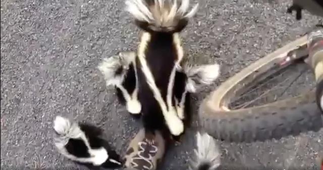 É isso que torna esse encontro tão único. Uma skunk mãe e seus quatro bebês skunks recentemente curiosamente se aproximaram de um ciclista.