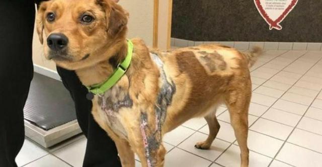 O cachorro havia sido pendurado pelo pescoço e um indivíduo desequilibrado o havia pulverizado com ácido. Milagrosamente, o animal sobreviveu.