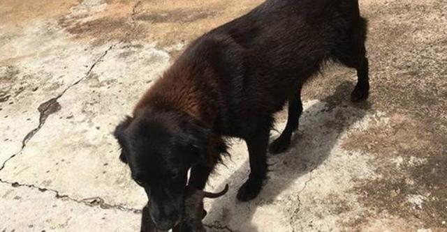 Quando ele voltou, viu que o cachorro estava segurando algo em sua boca. Parecia um animal morto, mas logo percebeu que na verdade era um filhote vivo.