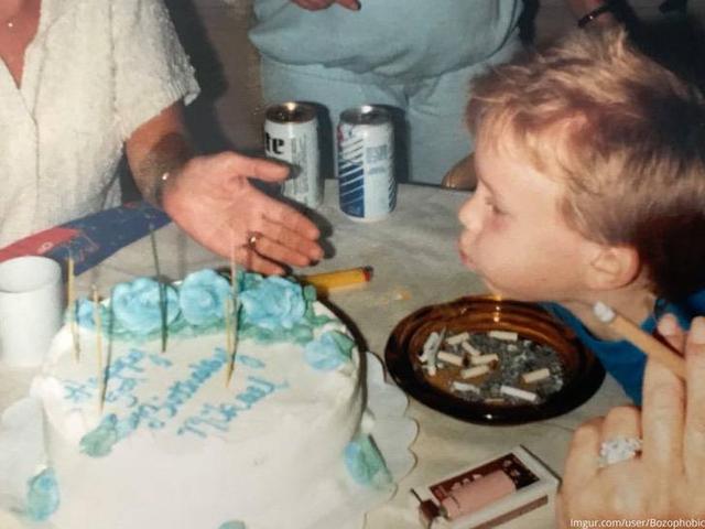 "Os anos 80, quando uma criança podia soprar suas velas de aniversário em um cinzeiro e ao lado de uma cerveja aberta enquanto alguém segurava um charuto aceso ao lado de seu rosto" era a mensagem postada na página do Facebook chamada "Historical Pictures" junto com a imagem do pequenino