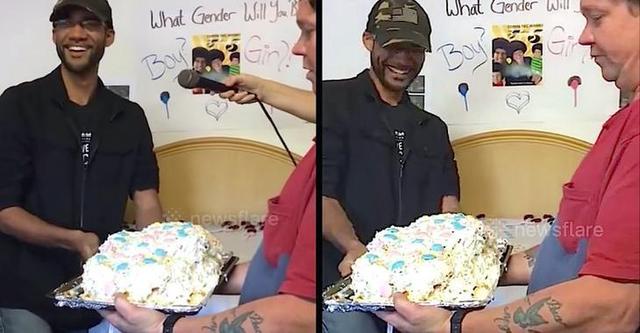 Mas enquanto o casal estava prestes a descobrir se o boneco seria azul ou rosa, a boneca em questão acidentalmente pulou do bolo!