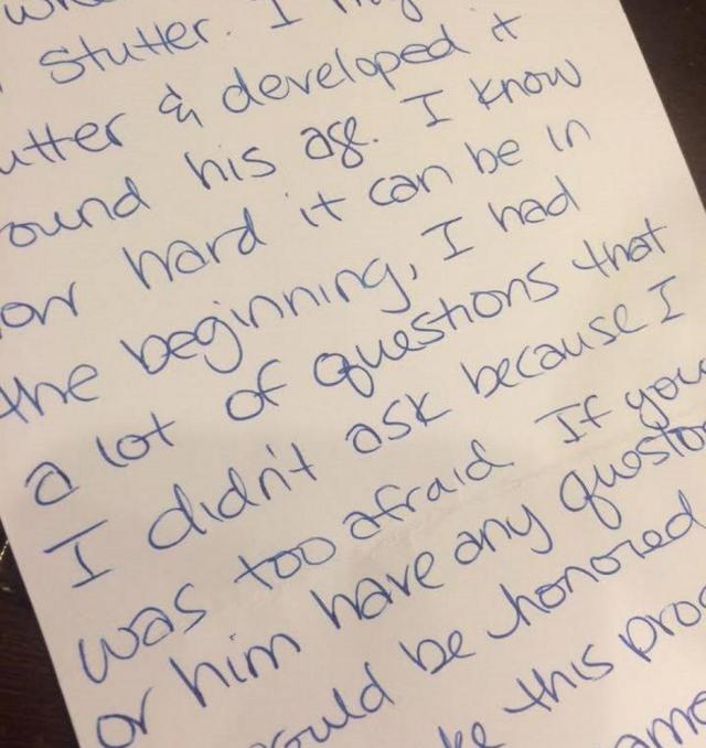 "A emoção repentina veio a mim quando ouvi seu filho gaguejar. Eu estava gaguejando na idade dele e sei o quão difícil pode ser no começo. "