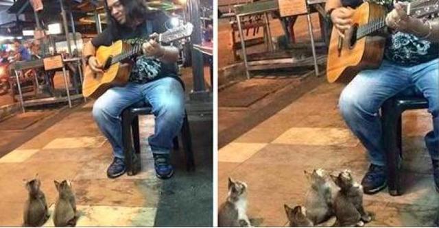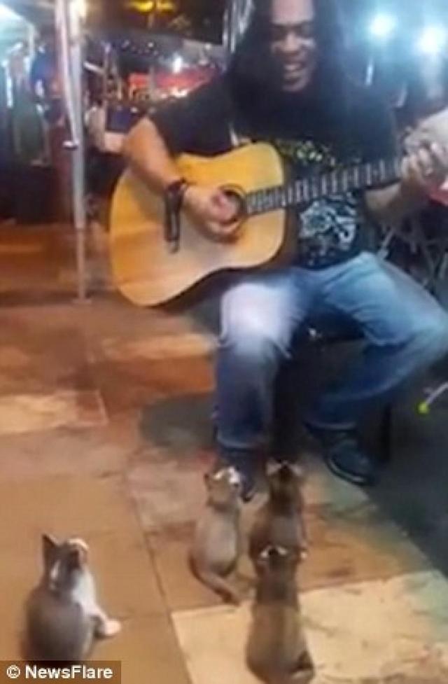 Este é o caso de um cantor na Malásia, que tocou violão. Animal Channel relata que o homem estava jogando, e ninguém estava prestando atenção. O homem de cabelos compridos ia reembalar seus instrumentos ... quando teve uma surpresa! Quatro gatinhos apenas algumas semanas atrás vieram ouvi-lo e encorajá-lo!