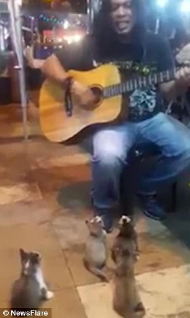 Os gatinhos pareciam literalmente fascinados pela peça. Eles ficaram na frente do guitarrista, de cabeça erguida, ouvindo atentamente as notas que saíam do instrumento. Eles até assentiram ao ritmo da música, tanto que eles apreciaram o momento! O homem não parecia acreditar no que estava acontecendo diante de seus olhos! Ele lutou para se conter de rir enquanto brincava!