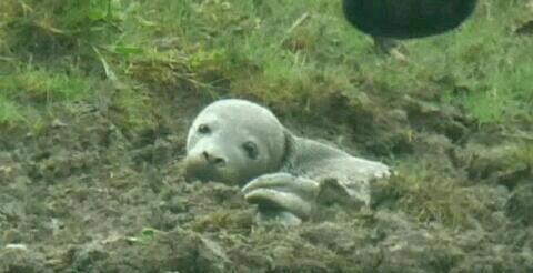 Um pequeno selo estava preso na lama! Aparentemente, o rapaz entrou no pântano durante a maré alta. Quando a maré voltou, deixou a pequena criatura encalhada.