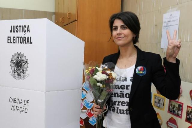 Brazil’s vice-presidential candidate for the Workers’ Party (PT) Manuela D’Avila, flashes the V-sign after voting during the second round of presidential election in Porto Alegre, Brazil© AFP Itamar AGUIAR