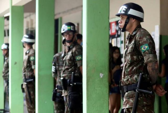 Brazilian soldiers stand guard as people wait in line to cast their votes at the polling center in Rio de Janeiro, Brazil© POOL/AFP RICARDO MORAES