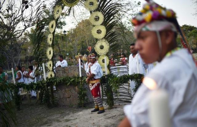 Mexican Totonac natives perform a ceremony to request permission from the gods, to hold the Tajin Summit Festival -aimed at preserving the Totonac legacy- in Papantla, Veracruz state, Mexico on March 8, 2019. The “Danza de los Voladores” – is a sacred pre-Hispanic ritual associated with soil fertility, named an Intangible cultural heritage by UNESCO in 2009© AFP RODRIGO ARANGUA