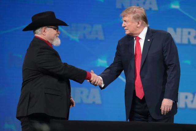 Le président américain Donald Trump salue Stephen Willeford, qui s’est interposé à la fin d’une tuerie dans une église texane, lors de la convention annuelle du puissant lobby des armes NRA à Indianapolis le 26 avril.© GETTY IMAGES NORTH AMERICA/AFP SCOTT OLSON