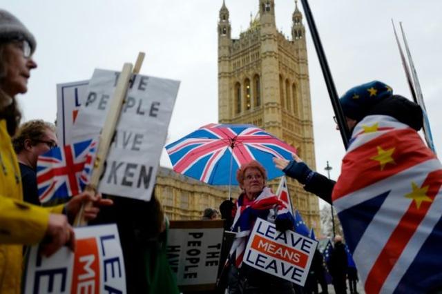 Pro- and ant- Brexit demonstrators protested outside Parliament as May announced the postponement of the vote on her Brexit agreement© AFP Tolga AKMEN