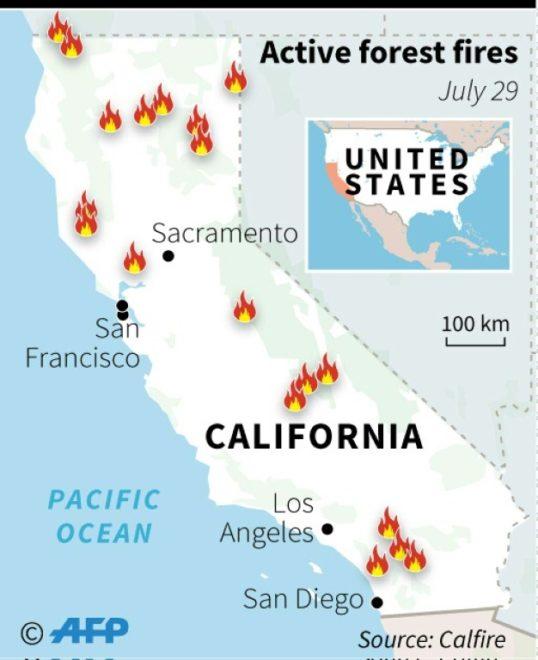 A map of California updating with the sites of major forest fires© AFP Li TONGTONG