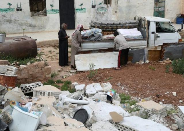 Residents of the jihadist-held Syrian village of Rabaa Jour pile their belongings on to the back of a pickup as they prepare to leave in search of refuge away from the front line© AFP OMAR HAJ KADOUR