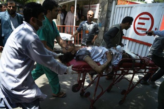An injured Afghan man is brought on a stretcher to an Italian aid organization’s hospital after a car bomb attack in Kabul© AFP WAKIL KOHSAR