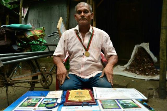 His wife complains that Sarder, a mason by trade, spends too much time with his trees doing unpaid volunteer work© AFP REDWAN AHMED